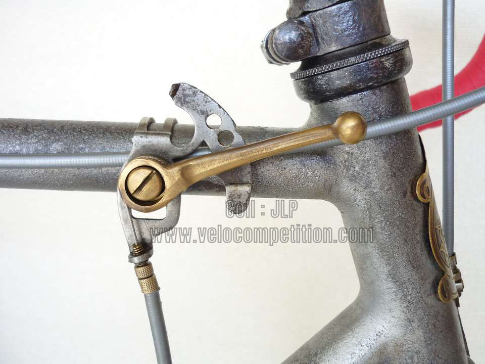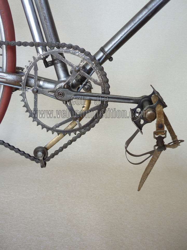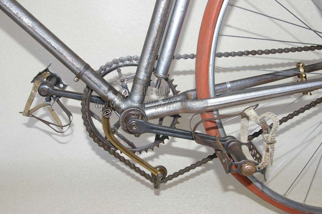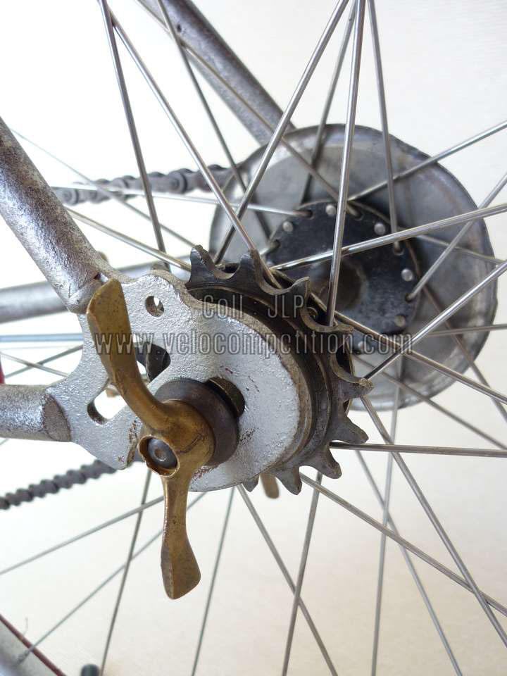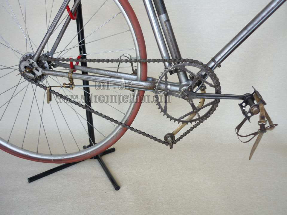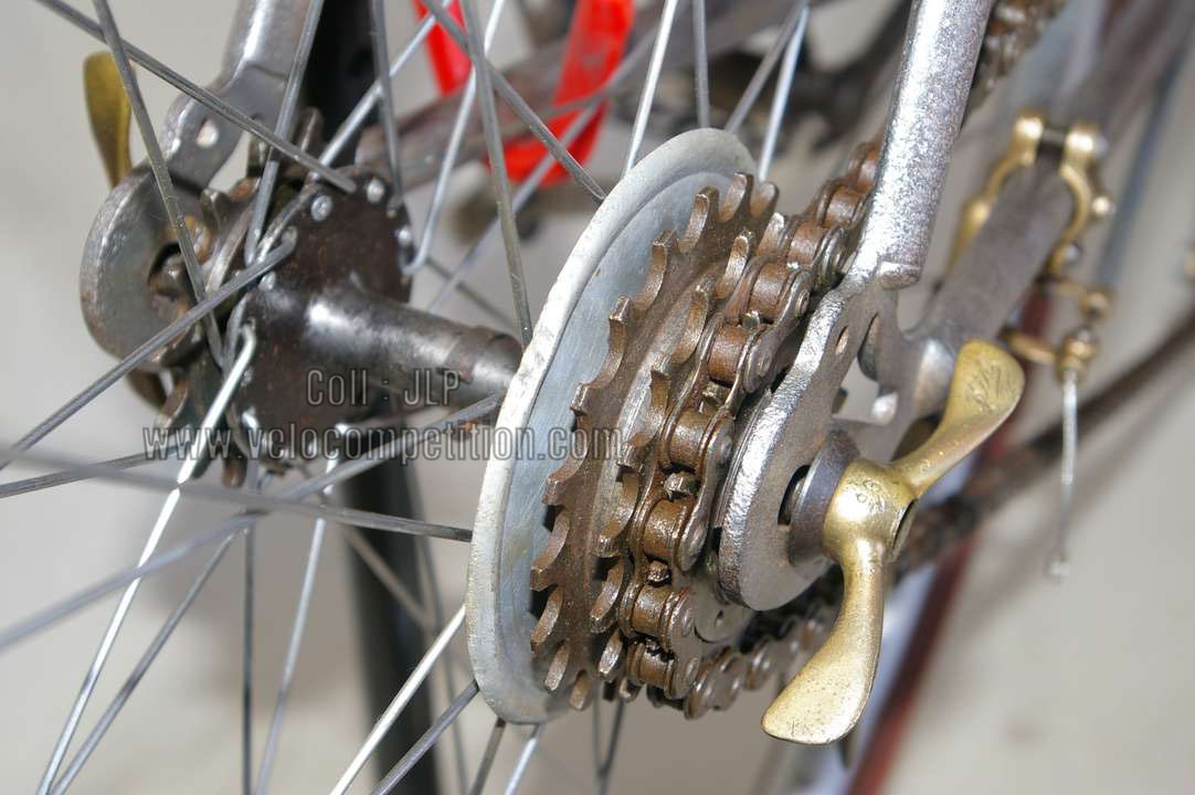 Vélo de course Blingham de 1937 avec son dérailleur Super Champion. Un tendeur de chaîne sous le pédalier (46 dents) et une fourchette reliée à une manette pour déplacer la chaîne sur la roue libre (3 vitesses à l’époque). La restauration a été longue 50 heures de travail mais le résultat est là.