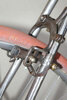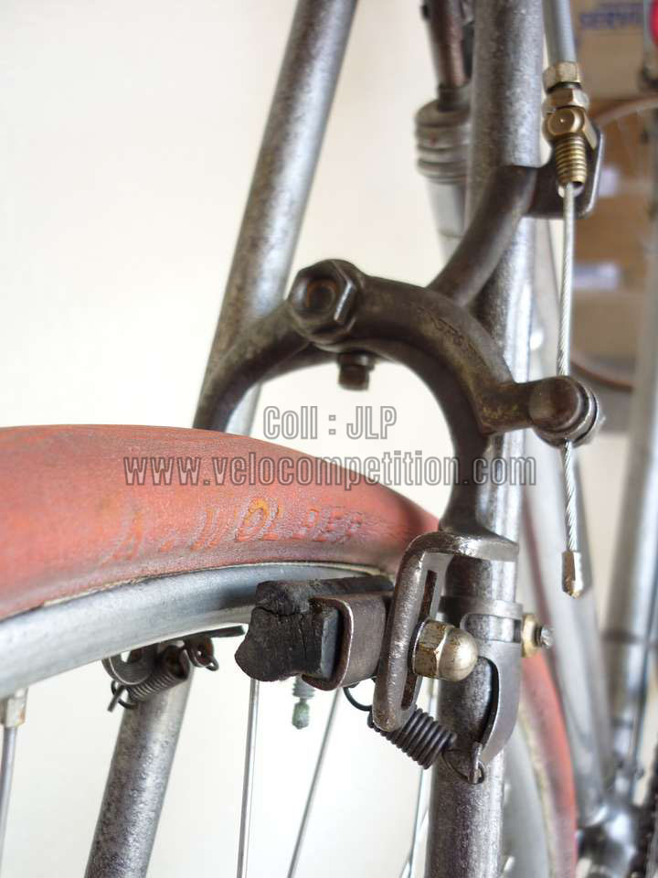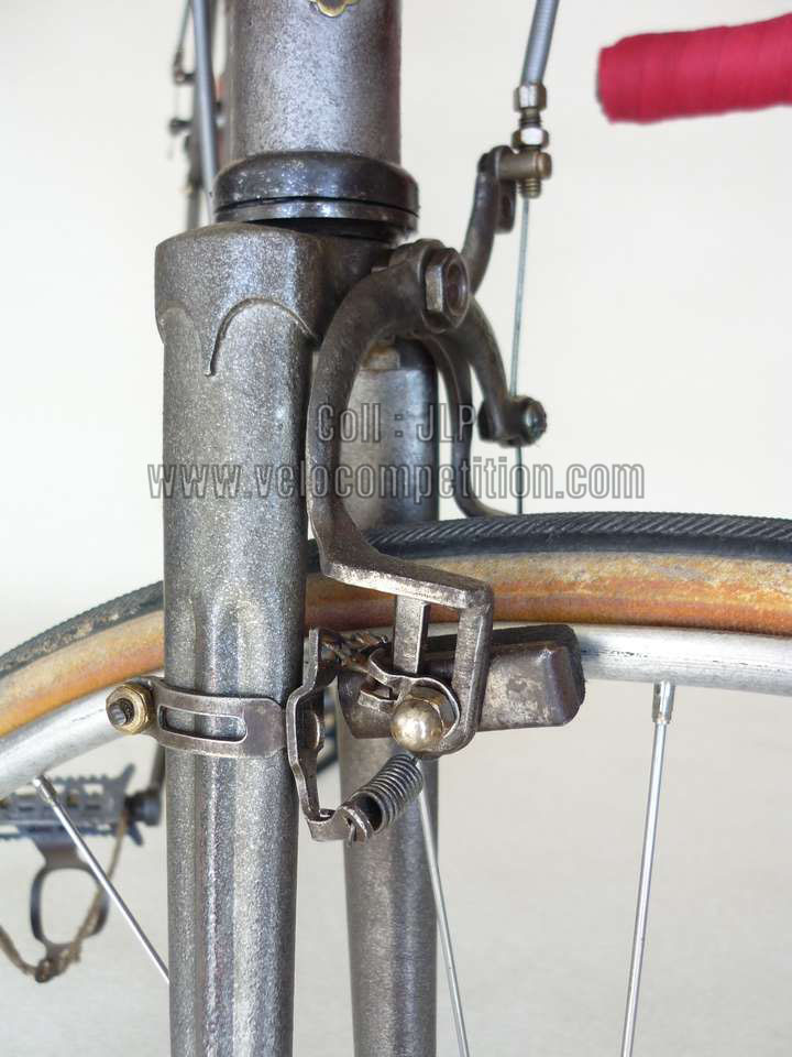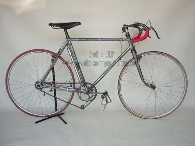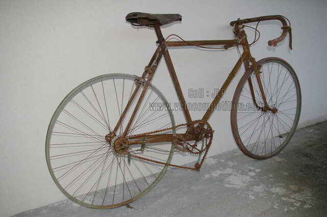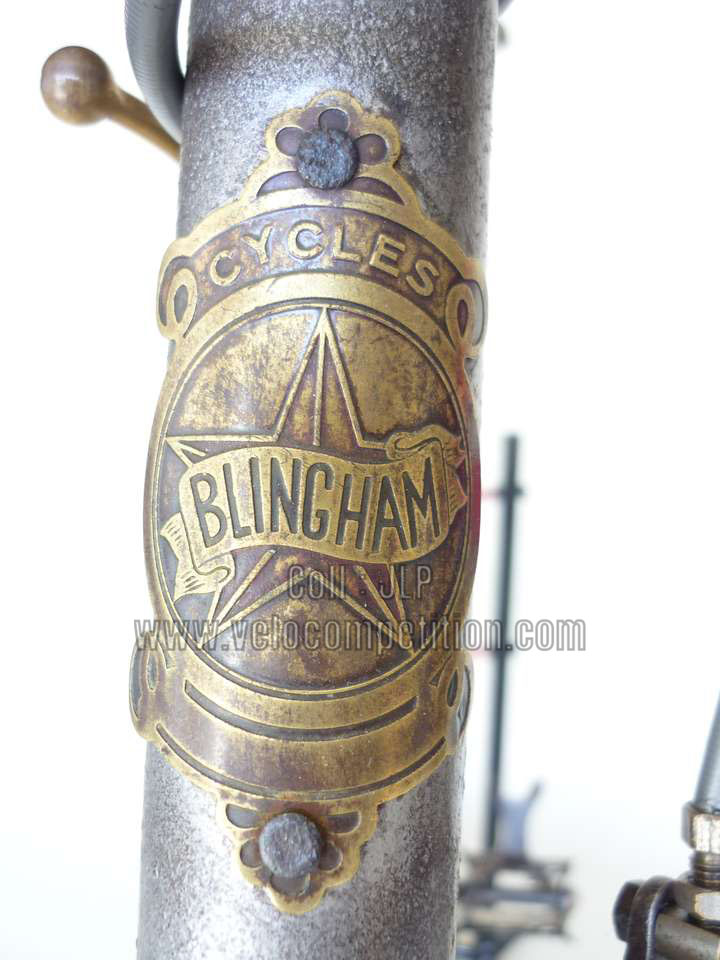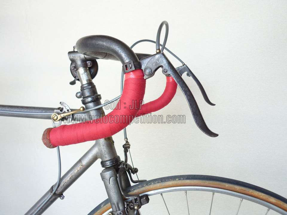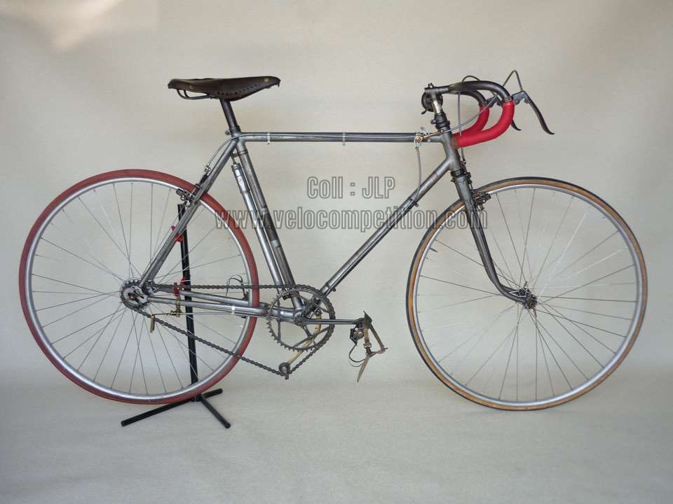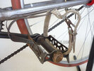 Vélo de course Blingham de 1937 avec son dérailleur Super Champion. Un tendeur de chaîne sous le pédalier (46 dents) et une fourchette reliée à une manette pour déplacer la chaîne sur la roue libre (3 vitesses à l’époque). La restauration a été longue 50 heures de travail mais le résultat est là.