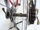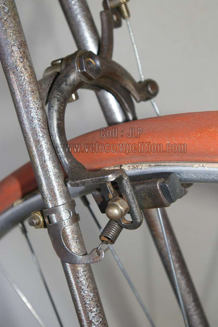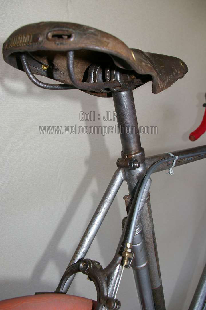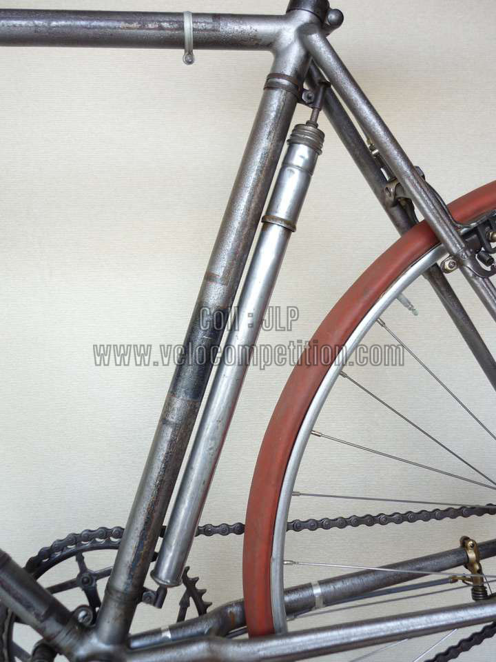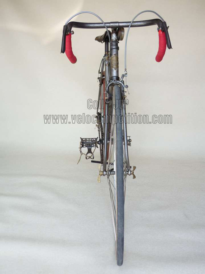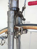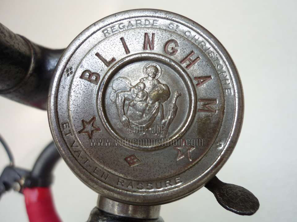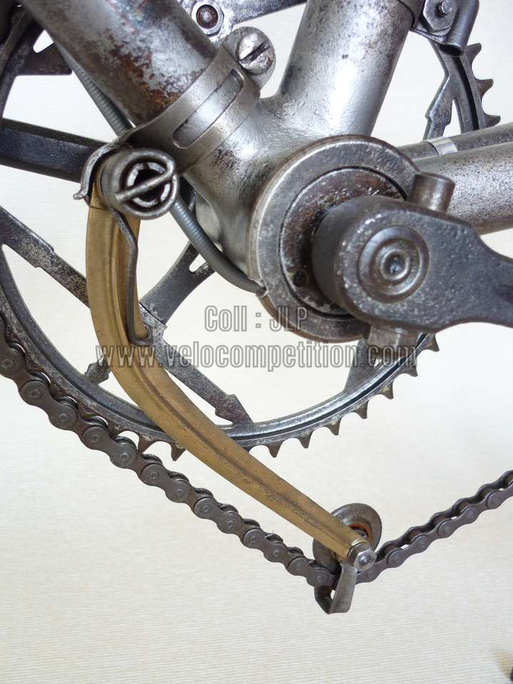 Vélo de course Blingham de 1937 avec son dérailleur Super Champion. Un tendeur de chaîne sous le pédalier (46 dents) et une fourchette reliée à une manette pour déplacer la chaîne sur la roue libre (3 vitesses à l’époque). La restauration a été longue 50 heures de travail mais le résultat est là.