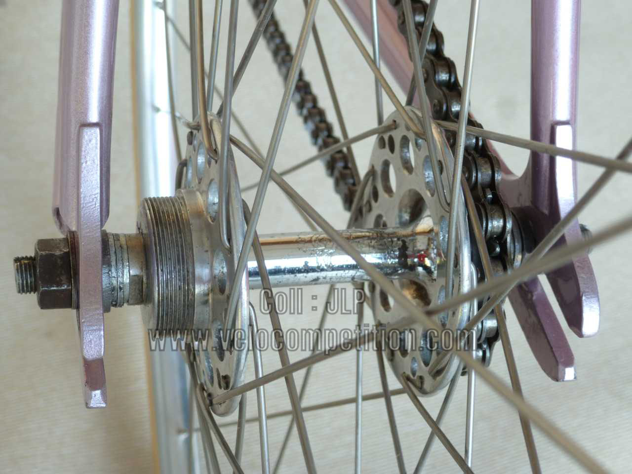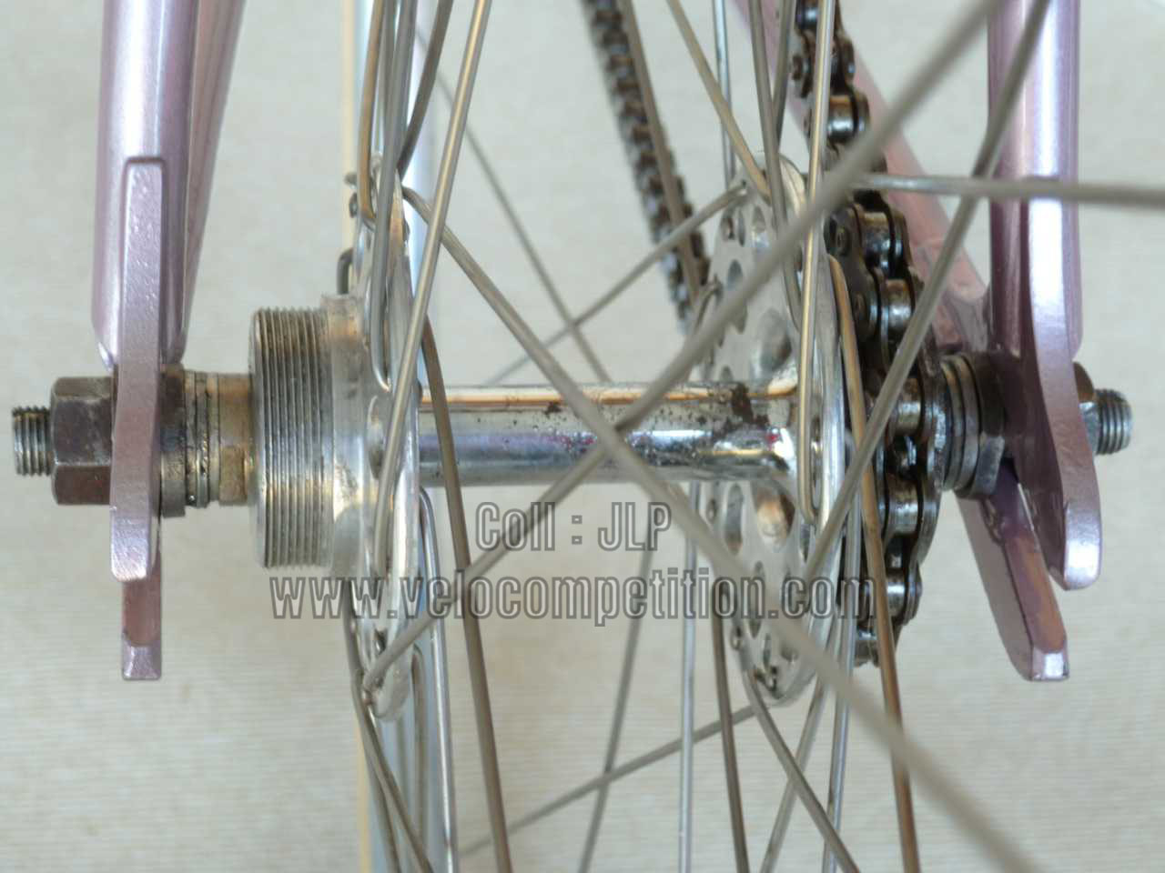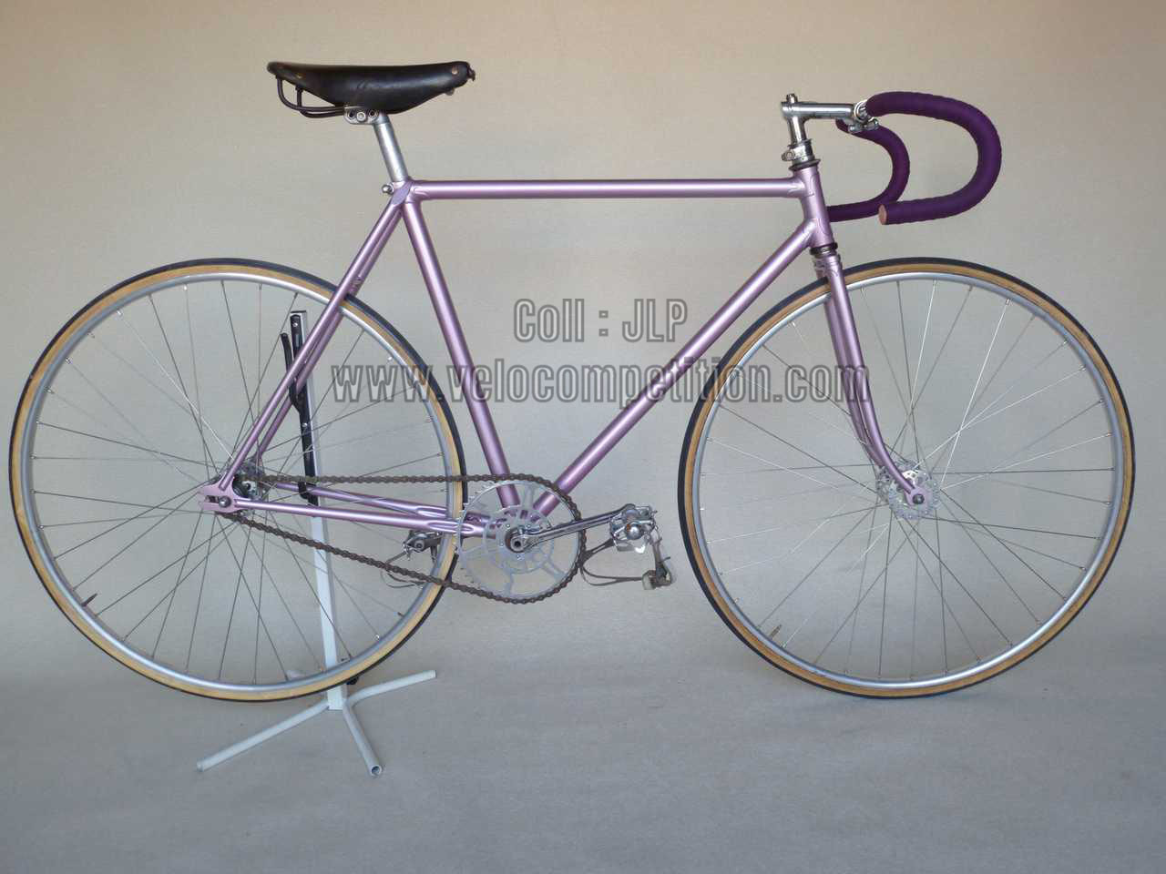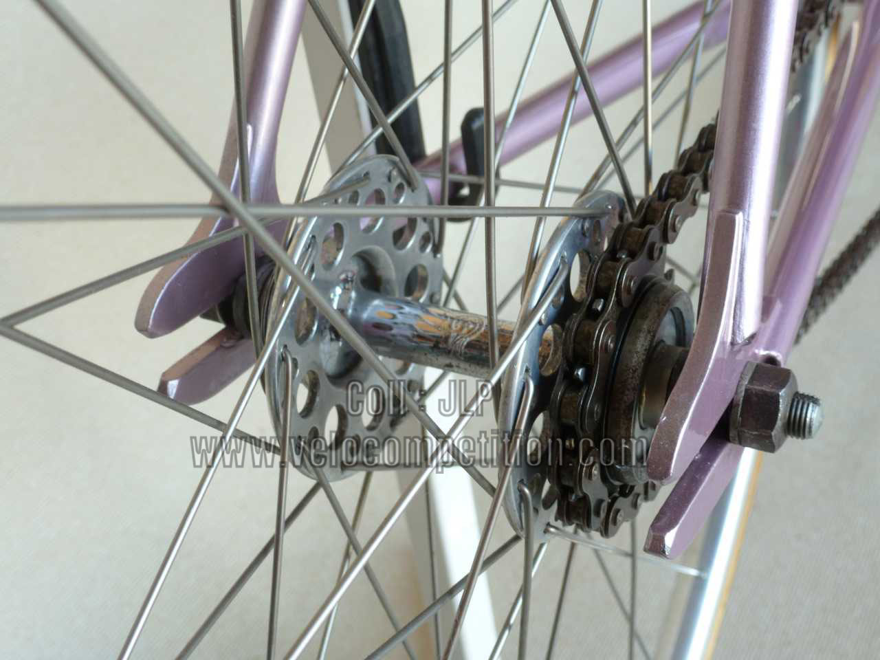 Le vélo a été repeint comme à l’origine, couleur retrouvée sur le pivot de la fourche au démontage et confirmé par Pierrot lui-même.