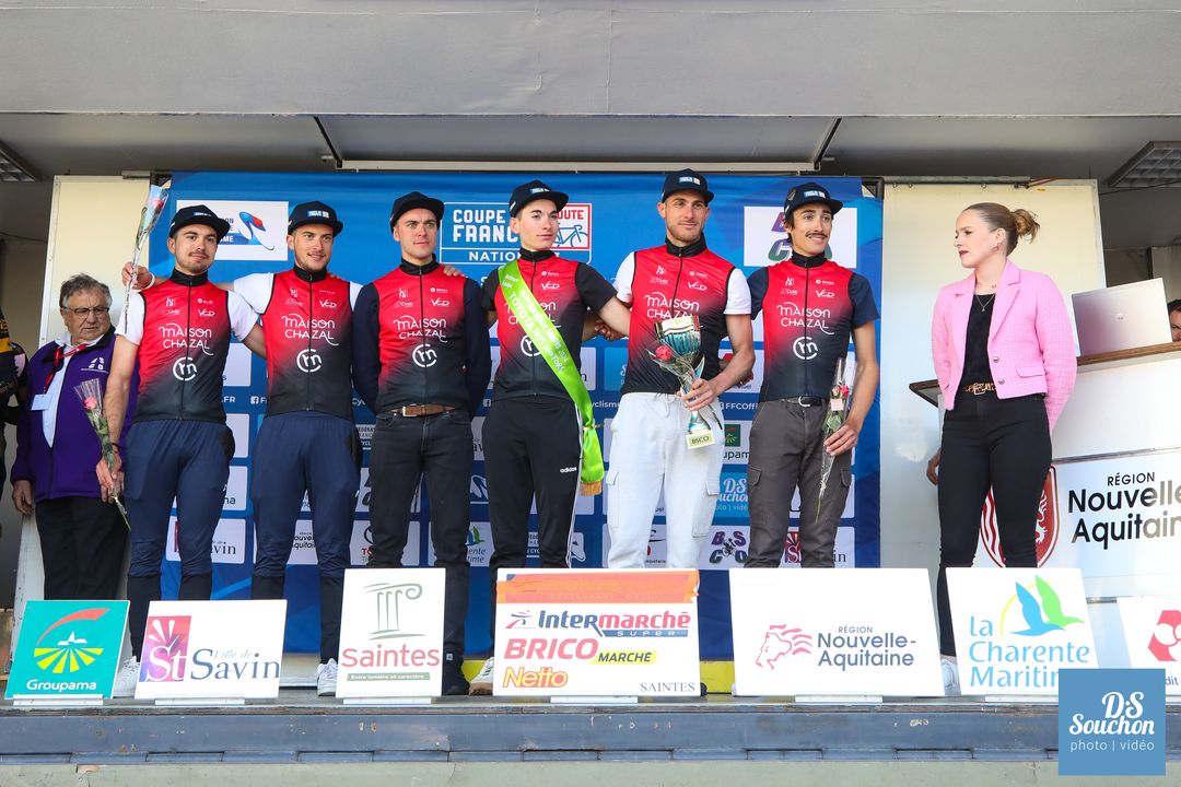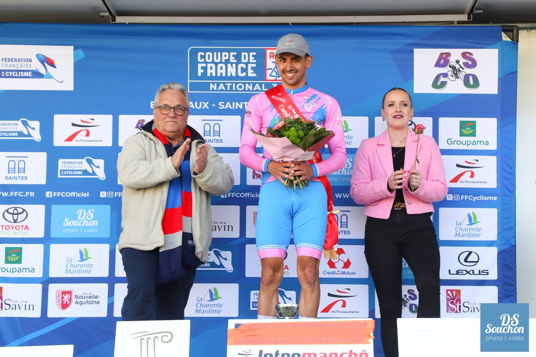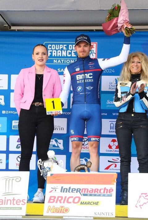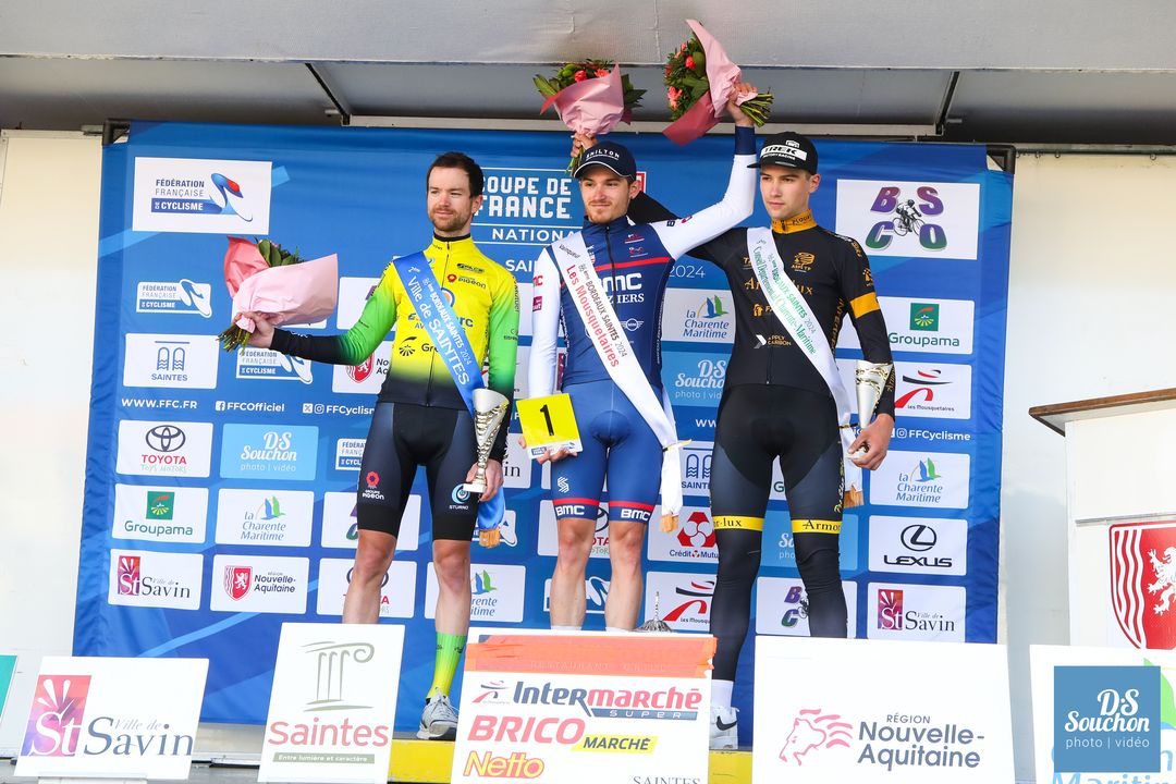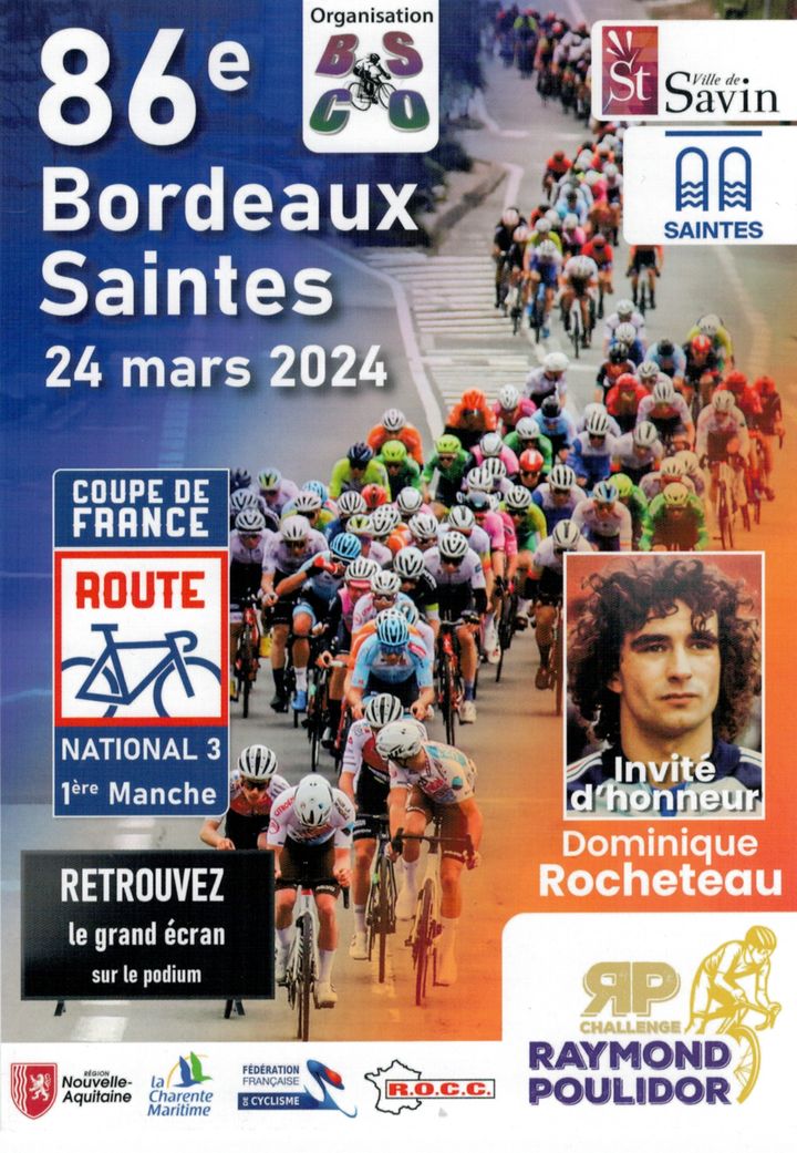 2024 - 86ème Bordeaux-Saintes Gauthier Navarro (Béziers Méditerranée Cyclisme) vainqueur du 86ème Bordeaux-Saintes 2024 1ère manche de la coupe de France N3. Classement – 1 Navarro Gauthier – 2 Renault Maxime – 3 Moulin Alan Titre Journal Sud Ouest Bordeaux Saintes 2024